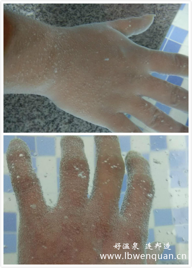 時不時手上會感覺到一種脹脹感,據介紹,此池水中的二氧化碳濃度達到了1000ppm以上,具有一定的康養功效,這些小氣泡促進全身的血液循環,去除毛孔中的垃圾,同時將氧氣和營養物質輸送遍全身所造成的感覺。長時間浸泡在此湯池之中,對滋潤皮膚、排除體內累積的毒素和老化物質有值得期待的效果。