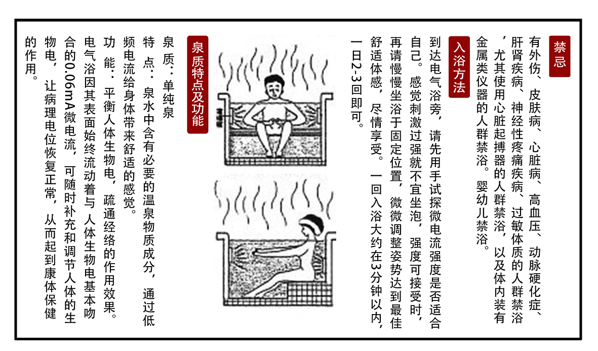【禁忌】 有外傷、皮膚病、心臟病、高血壓、動脈硬化癥、肝腎疾病、神經性疼痛疾病、過敏體質的人群禁浴,尤其使用心臟起搏器的人群禁浴,以及體內裝有金屬類儀器的人群禁浴。嬰幼兒禁浴。