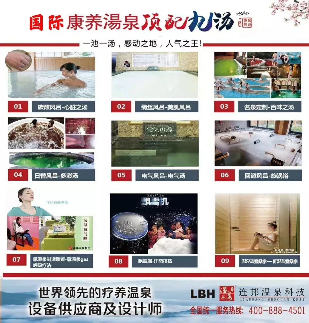 在眾多溫泉類景點中,最受游客關(guān)注的泉種是高濃度碳酸泉、絹絲浴、有馬鐵泉、回遊風呂、電氣湯、溫泉鹽霧桑拿、飄雪屋等,,形成了游客鐘愛的溫泉養(yǎng)生標配。
