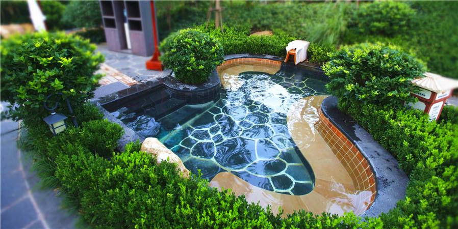 溫泉泡池之間的園路可以采用曲線型的設計,每一個泡池之間用彎曲的石路,木質的小橋、走道連接在一起,會顯得特別有神秘感,讓孩子們忍不住一探究竟。園路鋪設的材料,優先考慮釉面磚,因為它的吸水性強,表面還可做出各種圖案,便于清潔。